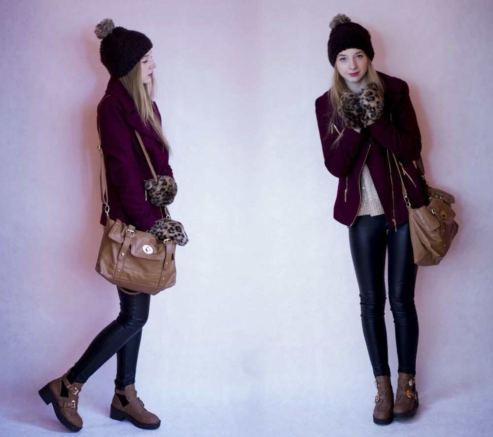 Dziś przyszedł czas na wypróbowanie nowego tła do zdjęć. Postawiłam na to rozwiązenie z uwagi, że pogoda nas nie rozpieszcza, a ja chcę aby blog nadal tętnił życiem. Będę prezentować czasem w ten sposób swoje zestawy. Zdjęcia zrobione tuż przed wyjściem - dla mnie bardzo wygodnie. A teraz o ubraniach. Typowo casual'owe zestawienie. Skórzane spodnie plus zupełnie nie skórzana kurteczka. Moje ulubione - czapka z pomponikiem i futrzane rękawiczki (prezent od siostry - absolutny must have na mrozy). Cekinowy sweterek jest delikatny i uroczy. Torba listonoszka dopasowana kolorystycznie do cudownych butów typu cut out. Uwielbiam je! Pewnie co post utwierdzacie się w przekonaniu, że zwariowałam na punkcie butów. Przyznaję się bez bicia. : )