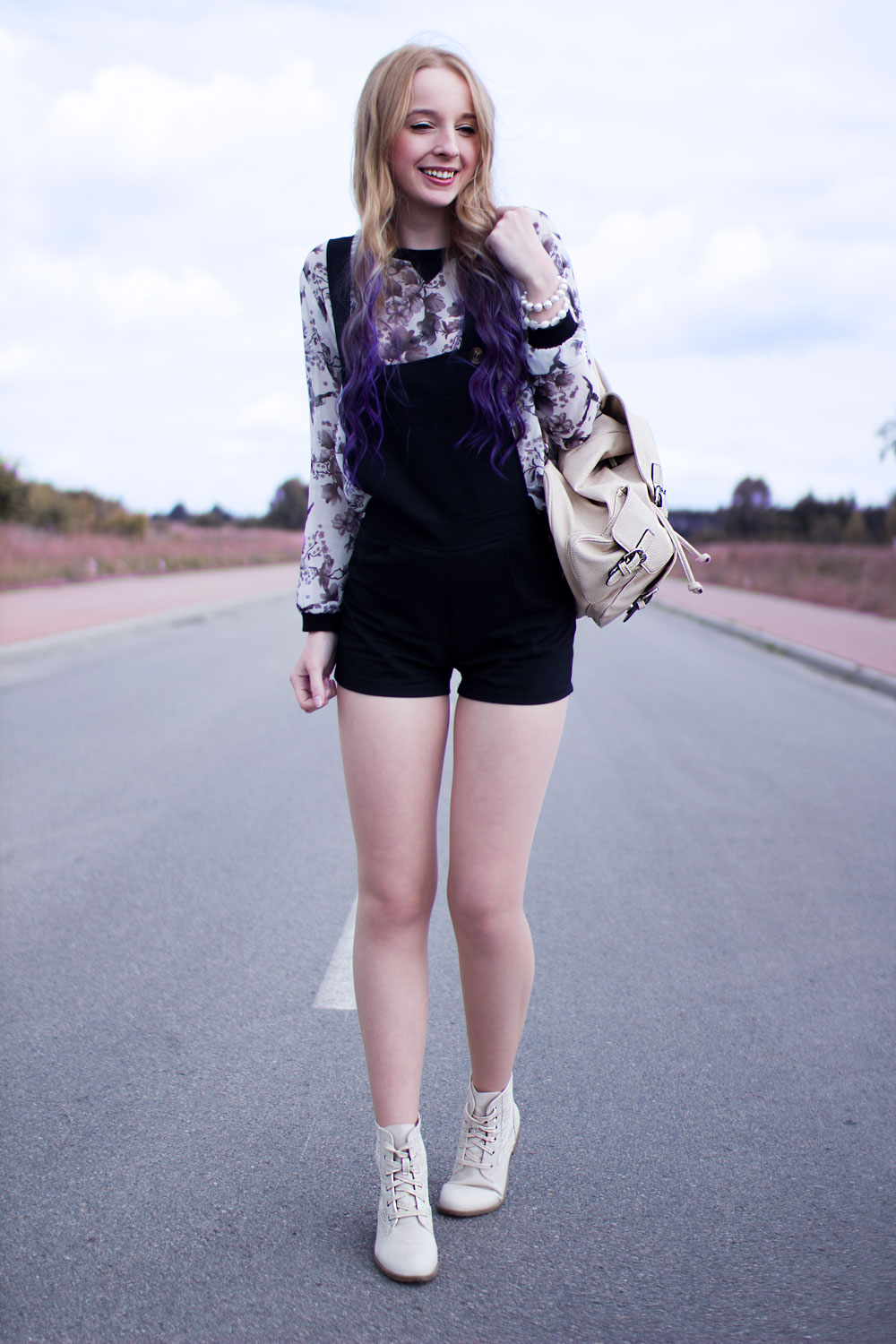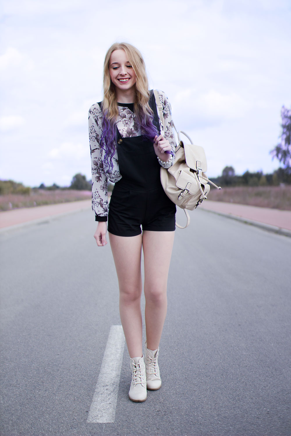 Amazing outfit! The overalls and the shirt look so cute together :) And your dip dyed purple hair is awesome!